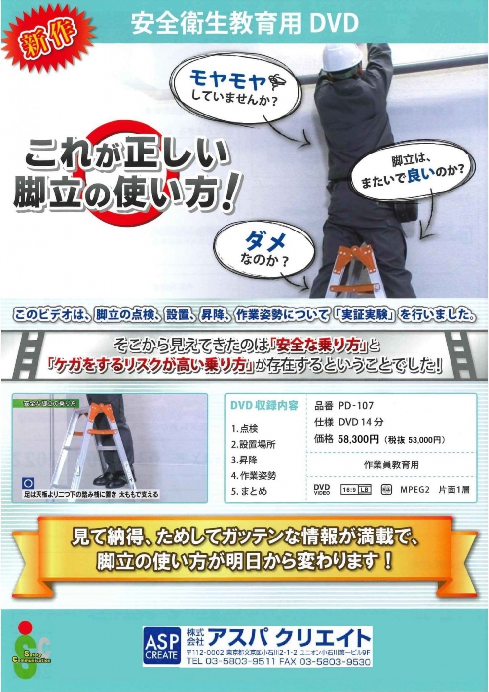 このビデオは、脚立の点検、設置、商工、作業姿勢の実証実験を行い、そこから見えてきた「安全な乗り方」と「ケガをするリスクが高い乗り方」について解説をしています。