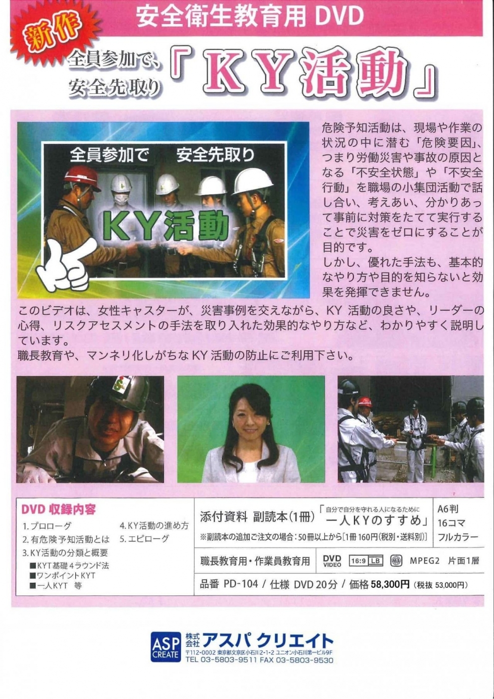 このDVDでは、災害事例を交えながら、KY活動の良さや、リーダーの心得、リスクアセスメントの手法を取り入れた効果的なやり方などを、わかりやすく説明しています。職長教育や、KY活動のマンネリ化防止にご利用ください。