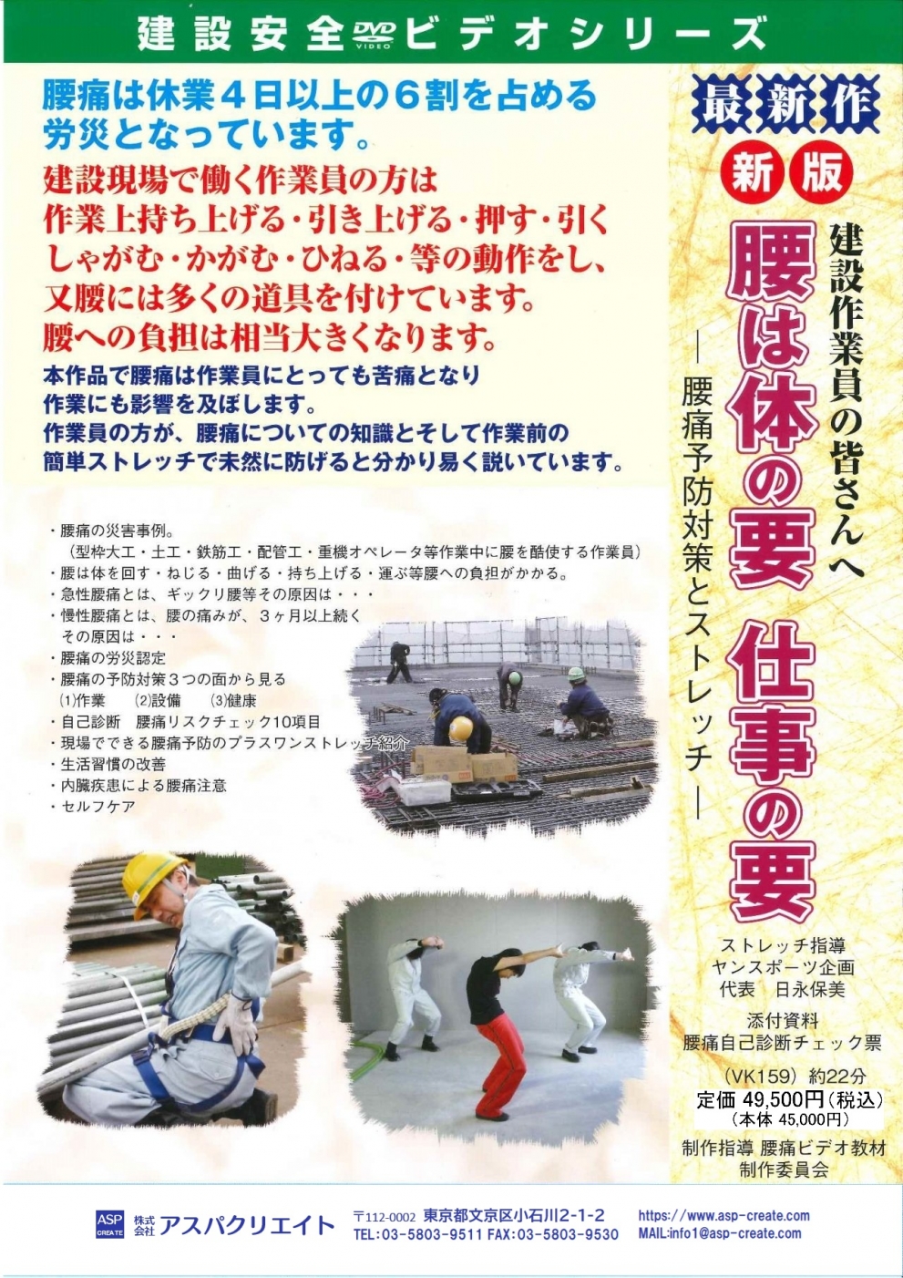 腰痛は休業4日以上の6割を占める労災となっています。 腰痛は作業員にとっても苦痛となり、作業にも影響を及ぼします。本作品は、作業員の方が腰痛についての知識とそして作業前の簡単ストレッチで未然に防げると分かり易く説いています。