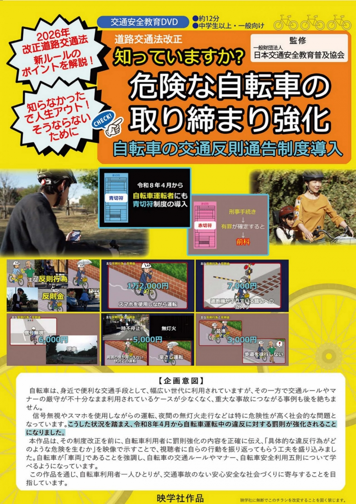 本作品は、その制度改正を前に、自転車利用者に罰則強化の内容を正確に伝え、「具体的な違反行為がどのような危険を生むか」を映像で示すことで、視聴者に自らの行動を振り返ってもらう工夫を盛り込みました。自転車が「車両」であることを強調し、自転車の交通ルールやマナー、自転車安全利用五則について学べるようになっています。