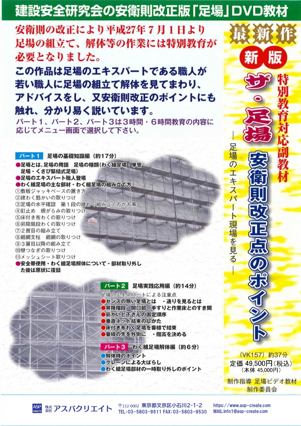 この作品は、足場のエキスパートである職人が、若い職人にアドバイスをする形で、足場の組立て・解体の要点や、安衛則改正のポイントを、分かり易く説いています。